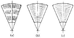 箅板孔的排列方式很多,常用的是同心圆排列和辐射状排列。同心圆排列(图 1-17(b))的孔是平行于物料和研磨体的运动轨迹。因此,对物料的通过阻力小,通过量较多,且不易堵塞,但过去的物料容易返回,而辐射状箅孔(图1-17(a))与此相反。对于双层球磨机隔仓板上的箅板由于不存在物料返回问题,从而消除了同心圆排列的缺点,而保留其优点。因此,双层隔仓板的箅孔通常都是同心圆排列的。为便于制造,同心圆排列常以其近似形状代替,形成多边形排列,如图1-17(c)所示。辐射状箅板对研磨体有牵制作用,使靠近箅板附近的研磨体有较大的提升高度,于是在空腔中出现了球面的高差,因而使集聚于球载轮廓中部为数较多的大研磨体优先移向隔仓板,同时将小研磨体陆续排挤到另一端。所以,卸料箅板不宜采用辐射状箅孔。