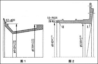 以Φ4000×1400湿式自磨机为例。湿式自磨机进料部由进料衬套和中空轴组成,它们的结构分别如图1和图2所示,该结构有两个配合面,为Φ1380面和Φ1420面,进料衬套上的两个配合面公差均为-0.410~-0.190,中空轴上的两个配合面公差为0~+0.220,两个相对应的配合面之间所形成的配合间隙大为0.63,小为0.19,中空轴前端有12个周布的、深度为40的M24内螺纹孔,与进料衬套上的12个Φ28孔相对应,中空轴和进料衬套之间就用这12根M24 的螺杆进行联接,进料衬套以这l2根螺杆进行轴向固定,依靠两个配合台面进行径向固定,进料衬套的运动则通过这l2根螺杆来传递。